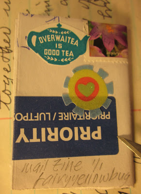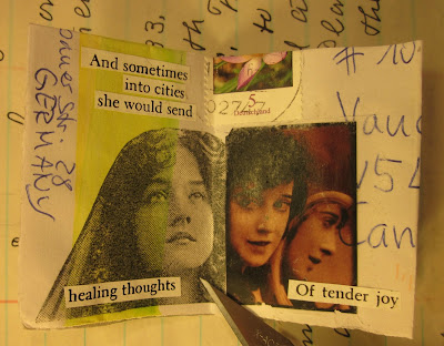 I received by airmail, snail mail it's sometimes called these days, a zine done by Lucia (she sent me a photocopy of her original as I was so in love with it.) The envelope that housed her zine was laying on my worktable and I just spontaneously picked it up and started and finished a little 'one-off' zine made from the front of her envelope. I didn't stop...it made itself, really, until I finished it. The muse speaking once again...