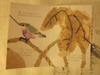 Firstly, this is a prototype, a design idea, a learning curve, an experiment. It is a zine about meditation and the graphics are collaged tea bag paper (used) with watercolour birds and stitched (oh it is awful but oh well) outlines for veins, etc. With all of its warts and (hateful due to machine issues, etc.) stitched boo-boos.